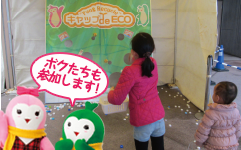 ■ペットボトルのキャップを投げて、キャップボード(写真)の穴に入ったら素敵な景品をプレゼント!