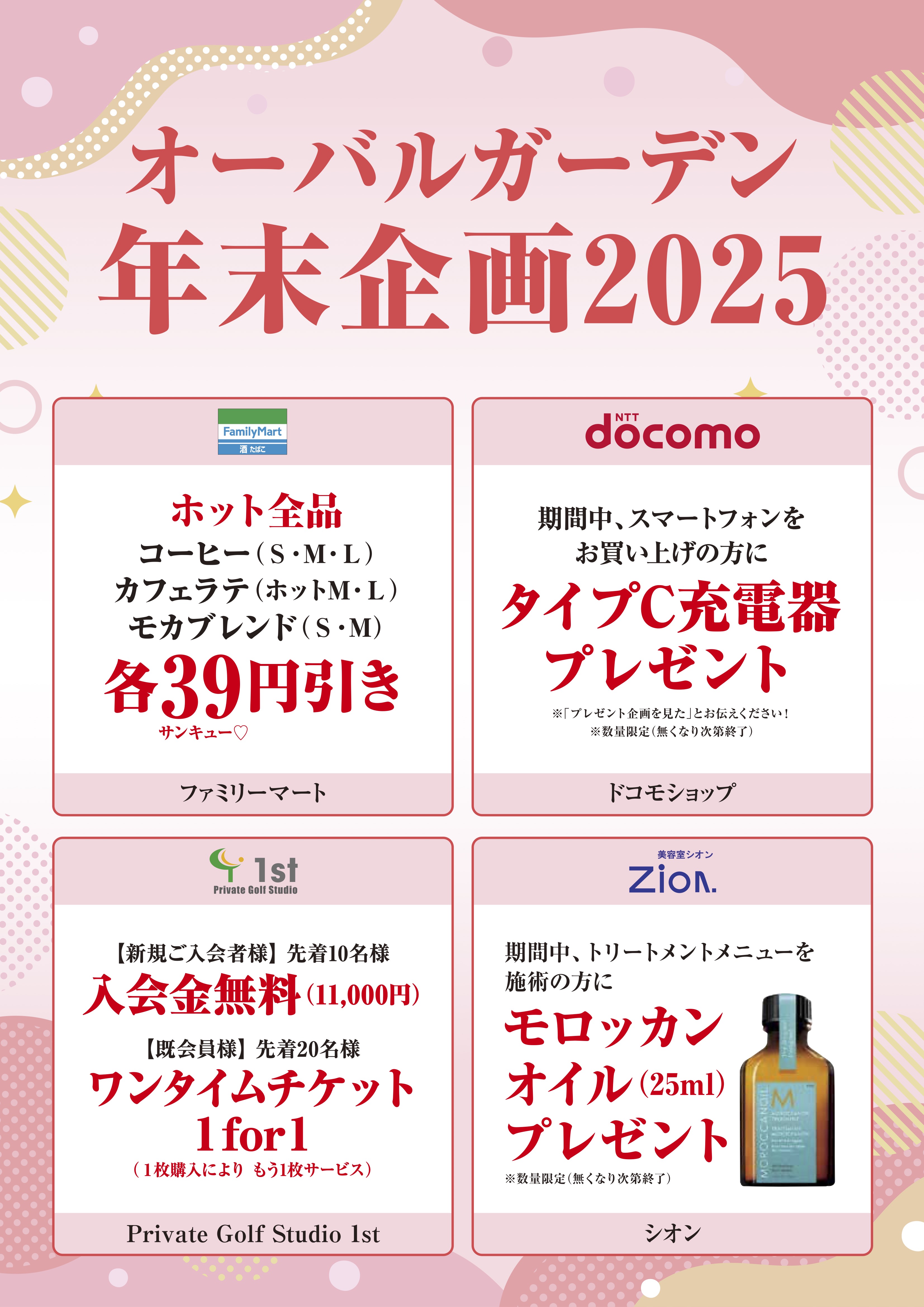 2025オーバルガーデン年末企画 2025オーバルガーデン年末企画 ーーーーーーーー ファミリーマート ドコモショップ ゴルフ 1st シオン ーーーーーーーー こちらの店舗では、日頃の感謝をこめて お得な企画をご用意しております 皆様のご来店をお待ちしております